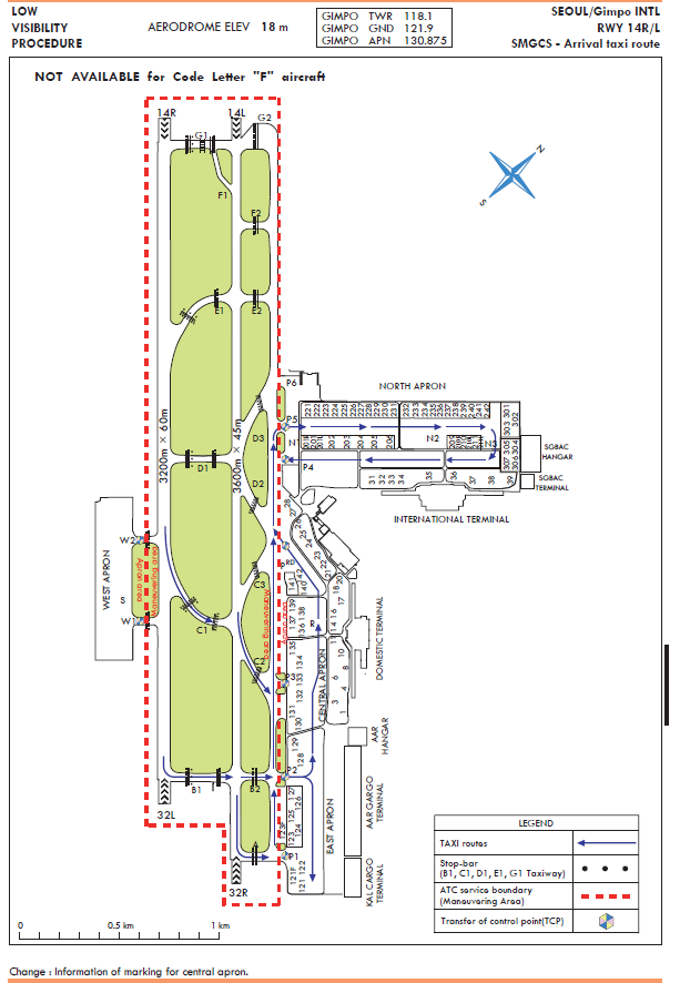 Between October and March of the coming year, migrant birds (mainly wild geese and ducks) build nests on Han river downstream (24 km north from Runway 14). The flock’s main activity apt to occur around the Gul-po stream close to the runway 14R and 14L area. Some part of the flock enter into the aerodrome for resting and feeding about an hour before sunrise till sunset. The flock size of one route is approximately 1 000 individuals. Sometimes the flock flies across the middle of the runways for their group movement in the daytime. The flying height varies from 200 ft to 1 000 ft.