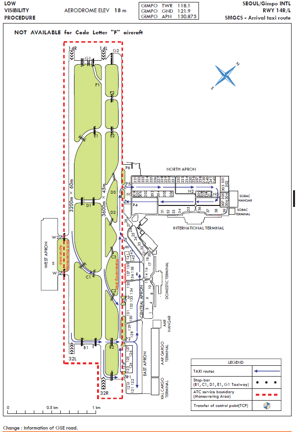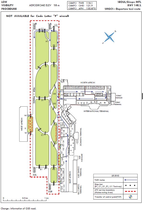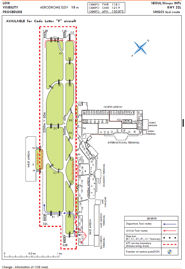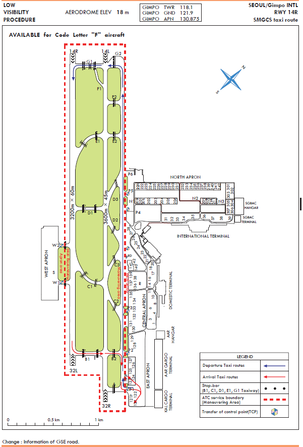 Between October and March of the coming year, migrant birds (mainly wild geese and ducks) build nests on Han river downstream (24 km north from Runway 14). The flock’s main activity apt to occur around the Gul-po stream close to the runway 14R and 14L area. Some part of the flock enter into the aerodrome for resting and feeding about an hour before sunrise till sunset. The flock size of one route is approximately 1 000 individuals. Sometimes the flock flies across the middle of the runways for their group movement in the daytime. The flying height varies from 200 ft to 1 000 ft.