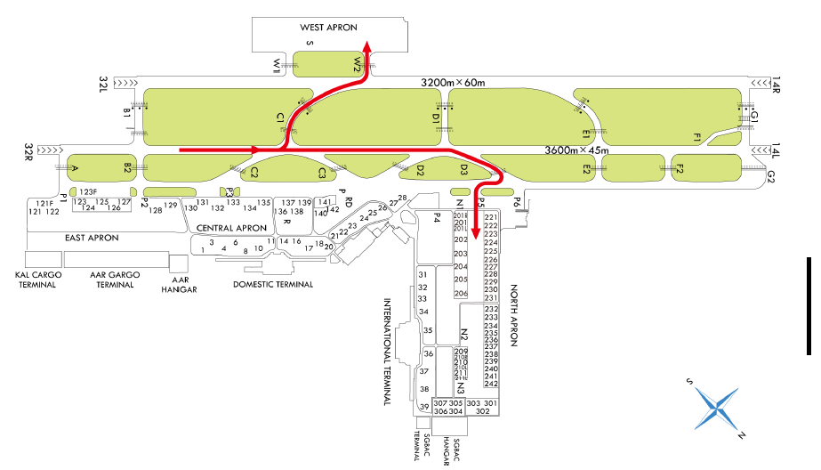 Width - A, B2, C1 - C3, D2, D3, E1, E2, F2 : 35 m - B1, D1, G1, W1, W2, P : 30 m - F1 : 23 m - G2 : 40 m Surface : Asphalt or Concrete Strength - A, G2 : PCN 85/R/B/W/T - P : PCN 70/F/B/X/T(PCN 72/R/A/W/T: 1 096 m from SE TWY end/282 m from NW TWY end) - B1 : PCN 74/F/B/X/T(PCN 85/R/B/W/T : a partial of TWY, 270 m) - B2, C1, C2, C3, D1, D2, D3, E1, E2, F1, F2, G1, W1, W2 : PCN 74/F/B/X/T |