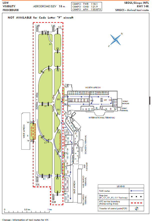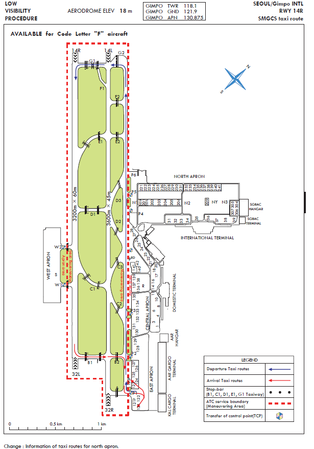 Between October and March of the coming year, migrant birds (mainly wild geese and ducks) build nests on Han river downstream (24 km north from Runway 14). The flock’s main activity apt to occur around the Gul-po stream close to the runway 14R and 14L area. Some part of the flock enter into the aerodrome for resting and feeding about an hour before sunrise till sunset. The flock size of one route is approximately 1 000 individuals. Sometimes the flock flies across the middle of the runways for their group movement in the daytime. The flying height varies from 200 ft to 1 000 ft.